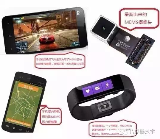 苹果(Apple)公司于2007年首度将微机电系统(MEMS)加速度计应用在iPhone中,开启手机产业的传感器革命。iPhone6 Plus就使用了加速度计、陀螺仪、电子罗盘、气压计、指纹传感器、接近与环境光传感器、MEMS麦克风和Image Sensor等MEMS传感器。截至目前为止,Apple公司已拥有超过三百五十篇以上与传感器相关的发明专利,而申请内容包括触控、影像、运动、振动感测、数据运算、掉落感知及亮度感知等等。游戏机 是运动跟踪和手势识别应用的突出代表,以具有革命性的任天堂Wii游戏机为例, 采用了MEMS三轴加速度计,能够捕捉到玩家任何细微的动作,使玩家陶醉于真实的游戏体验,通过不同的动作融入到游戏中,例如,模仿一场真实的网球赛、一场引人入胜高尔夫球赛、一场紧张的拳击赛或轻松的钓鱼比赛的动作。高能效低价微型MEMS传感器彻底改变了人们与移动终端设备的互动方式。在各类移动终端、游戏机、遥控器等设备上,MEMS传感器可以实现先进的功能,令人心动的用户界面,用户的手势、碰摸就能够激活相应的功能。为消费电子产品的“”升级、换代”划成一个里程碑式的注脚。智能穿戴装置 是目前最热门的新兴产品,其所使用的感测组件,无论在尺寸、耗电量、感测灵敏度或是组件可靠度上,通常皆须面对更严苛的要求。最成功的组件案例是惯性传感器与MEMS麦克风,包括Google、Apple、微软(Microsoft)、摩托罗拉(Motorola)等多家知名大厂,皆已将此两组件整合在自家的穿戴装置产品内,成为其传感器标准配备。智能穿戴装置两大功能项目在于量化生活(Quantified Self)及随身环境安全监测。其所需感测功能大致可包括活动感知、影像感测、环境感测及生理感测四大类别。MEMS组件在穿戴装置上的应用诉求,是使系统达到微小化、低功耗、高性能及多功能整合等目的。健身和健康监测就是MEMS传感器在智能穿戴装置中的代表性的应用。计步表或计步器是利用三轴MEMS加速度传感器,在特定的情况下,计步器的传感器能够精确地测定在步行和跑步过程中作用在系统上的加速度,通过处理加速度数据,计步器显示用户走过的步数和速度,以及在身体运动过程中所消耗掉的热量。MEMS传感器应用在航空航天领域,要求适应在不同的空间环境,包括:真空、电磁辐射、高能粒子辐射、等离子体、微流星体、行星大气、磁场和引力场等,以及航天器某些系统工作时或在空间环境作用下产生的诱导环境,例如,轨道控制推力器点火和太阳电池翼伸展引起的振动、冲击环境;航天器上的磁性材料和电流回路在空间磁场中运动产生的感应磁场;航天器上有机材料逸出物沉积在其他部位造成的分子污染等。因此,航空航天传感器主要有状态传感器,环境传感器之分,前者包括各种活动机件的即时位置传感器,如襟,副翼位置,喷口大小,油门位置,减速板位置,起落架收放位置等,飞机状态传感器,如迎角,侧滑角传感器,飞机姿态传感器等,各种参数如液压,油压,发动机振动量,滑油金属屑,各种消耗品如油料剩余量,消耗速度等,还有结冰传感器,火警传感器,极限传感器,过载传感器,生命传感器以及各种多余度系统的自动转换传感器。环境传感器主要有温度传感器、湿度传感器、氧气传感器、压力传感器、流量传感器等。MEMS传感器在航空航天领域中主要有五种用途: