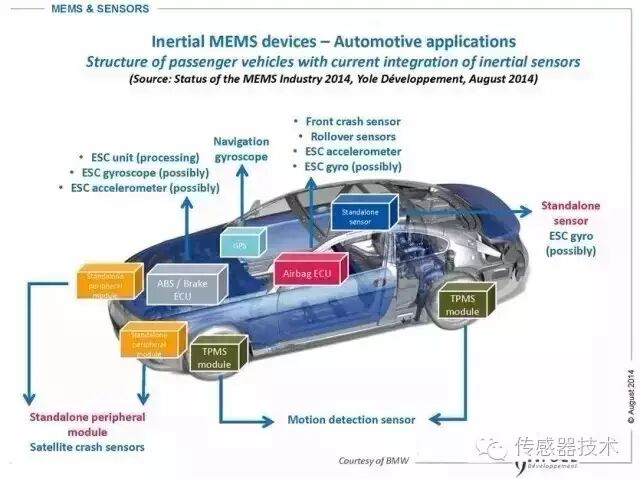 随着电子技术的发展,MEMS的应用领域越来越广泛,由最早的工业、军用航空应用走向普通的民用和消费市场。在智能手机上,MEMS传感器提供在声音性能、场景切换、手势识别、方向定位、以及温度/压力/湿度传感器等广泛的应用;在汽车上,MEMS传感器借助气囊碰撞传感器、胎压监测系统(TPMS)和车辆稳定性控制增强车辆的性能;医疗领域,通过MEMS传感器研成功制出微型胰岛素注射泵,并使心脏搭桥移植和人工细胞组织成为现实中可实际使用的治疗方式;在可穿戴应用中,MEMS传感器可实现运动追踪、心跳速率测量等。汽车电子产业被认为是MEMS传感器的第一波应用高潮的推动者,MEMS传感器在汽车上应用的快速发展主要是受益于各国政府全面推出汽车安全规定(比如要求所有汽车采用TPMS系统)和汽车智慧化的发展趋势。全球平均每辆汽车包含10個传感器,在高档汽车中,大约采用25至40只MEMS传感器,车越好,所用的MEMS就越多,BMW740i汽车上就有70多只MEMS。MEMS传感器可满足汽车环境苛刻、可靠性高、精度准确、成本低的要求。其应用方向和市场需求包括车辆的防抱死系统(ABS)、电子车身稳定程序(ESP)、电控悬挂(ECS)、电动手刹(EPB)、斜坡起动辅助(HAS)、胎压监控(EPMS)、引擎防抖、车辆倾角计量和车内心跳检测等等。目前,压力传感器、加速度计、陀螺仪与流量传感器四类器件合计占汽车MEMS系统的99%。MEMS压力传感器是汽车中应用最多的传感器, 至少18个汽车应用领域促进压力传感器的增长,包括:轮胎压力,电子稳定控制系统中的刹车传感器,侧面气囊,与日益严格的排放标准相关的引擎控制,大气压力与废气再循环压力。这种传感器用单晶硅作材料,以采用MEMS技术在材料中间制作成力敏膜片,然后在膜片上扩散杂质形成四只应变电阻,再以惠斯顿电桥方式将应变电阻连接成电路,来获得高灵敏度。车用MEMS压力传感器有电容式、压阻式、差动变压器式、声表面波式等几种常见的形式。MEMS加速度计的原理是基于牛顿的经典力学定律,通常由悬挂系统和检测质量组成,通过微硅质量块的偏移实现对加速度的检测,主要用于汽车安全气囊系统、防滑系统、汽车导航系统和防盗系统等,除了有电容式、压阻式以外,MEMS加速度计还有压电式、隧道电流型、谐振式和热电偶式等形式。其中,电容式MEMS加速度计具有灵敏度高、受温度影响极小等特点,是MEMS微加速度计中的主流产品。微陀螺仪是一种角速率传感器,主要用于汽车导航的GPS信号补偿和汽车底盘控制系统,主要有振动式、转子式等几种。应用最多的属于振动陀螺仪,它利用单晶硅或多晶硅的振动质量块在被基座带动旋转时产生的哥氏效应来感测角速度。例如汽车在转弯时,系统通过陀螺仪测量角速度来指示方向盘的转动是否到位,主动在内侧或者外侧车轮上加上适当的制动以防止汽车脱离车道,通常,它与低加速度计一起构成主动控制系统。MEMS流量传感器是基于传统的热膜片风力计原理借助先进的薄膜片技术,将性能稳定的薄膜片电阻加工到一片薄膜上。由于采用了MEMS加工,因此一方面缩短了传感器响应时间,另一方面由于采用了前后桥电路,可以判断出流体流向,从而进一步测量出回流流量。为了防止温度变化对测量精度的影响,传感器中采用了两片热敏电阻分别对前后桥进行了温度补偿。流量传感器主要用于检测发动机的空气进气量和燃油喷射量,从而将空燃比控制在最佳值附近,此外流量传感器还广泛利用于排气再循环、防滑驱动、刹车防抱死系统以及电控悬架等许多方面。 按销售额计算,最大的五种汽车MEMS应用按降序排名是:ESC,安全气囊,进气歧管绝对压力(MAP),TPMS与翻滚探测。随着消费电子领域大发展及产品创新不断涌现,特别是受益于智能手机和平板电板的快速发展,消费电子已经取代汽车领域成为MEMS最大的应用市场。其中手机和平板电脑中的MEMS传感器几乎占了消费类电子MEMS传感器类市场的90%。MEMS传感器在消费电子领域的应用包括运动/坠落检测、导航数据补偿、游戏/人机界面、电源管理、GPS增强/盲区消除、速度/距离计数等等,这些MEMS技术都在很大程度上提高了用户体验。终端设备内的硬盘驱动器坠落保护 是MEMS运动传感器在消费电子市场的具有重要历史意义的代表性应用之一。手提电脑内的三轴加速计可以监测加速度,因为具有特定的功能和数据处理电路,它能够检测到硬盘驱动器的意外摔落事故,并及时命令读写头缩回到安全位置,以防电脑最终摔落在地板上时损坏读写头。手机 是MEMS在消费类产品中最大的应用领域。包含MEMS麦克风、3D加速器、RF被动与主动组件、相机稳定与GPS的陀螺仪、小型燃料电池与生化芯片等,应用最多的传感器是加速计、陀螺仪与MEMS硅麦克风,其中加速度计是该市场中第一大应用产品。而近期陀螺仪增长迅速,已经成为继加速度计后的第二大应用产品。MEMS麦克风销售额2015年已经突破10亿美元,美国IHS全球产业研究报告表示全球MEMS麦克风市场仍将连续5年维持18%的年复合成长率(CAGR)。还有一些MEMS传感器或刚进入市场的,例如磁力计、指纹传感器、环境传感器、MEMS手机摄像头等。而MEMS传感器在手机应用的数量规模以及多样性,也仍不断在快速成长当中。